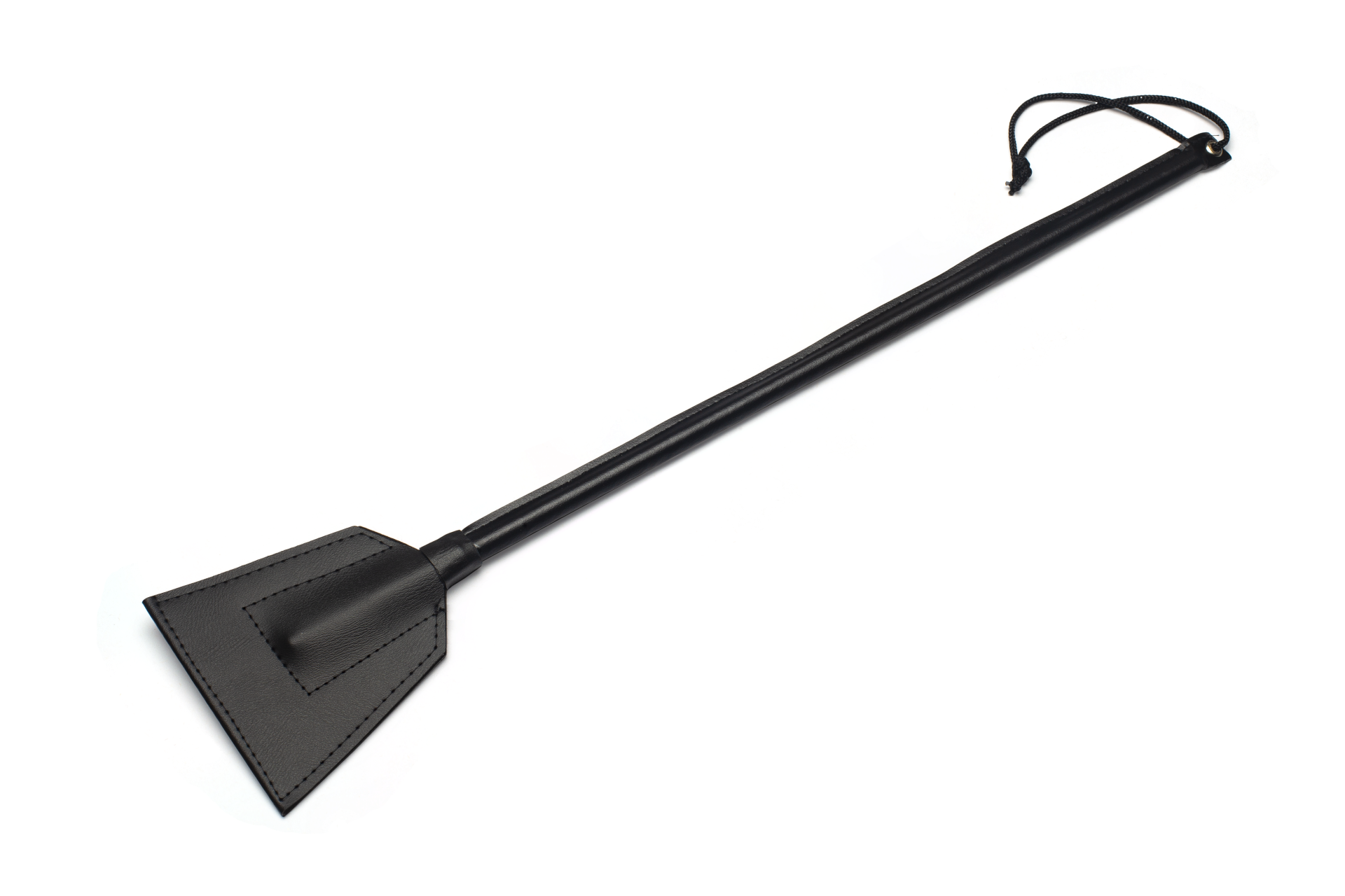 O cabo da chibata tem 40cm, é revestido em couro sintético, possui alça auxiliar para punho e sua cor é preta.