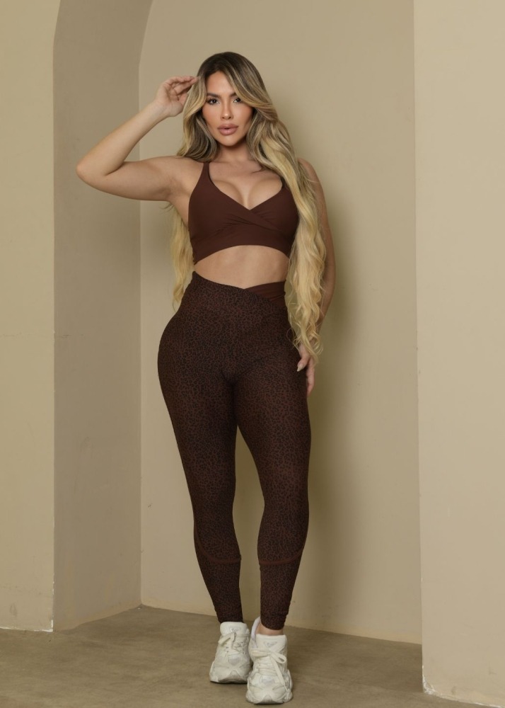 O nosso Conjunto Fitness Premium une o design sofisticado de um top liso com decote transpassado e o estilo atemporal da legging estampa de oncinha, com cós em "V" que afina a cintura. Tudo isso pensado estrategicamente para o seu conforto e beleza.